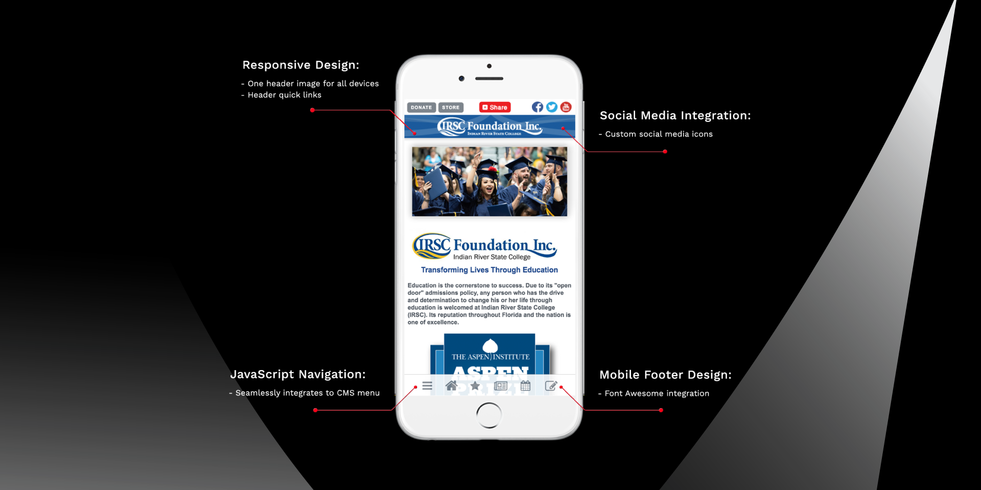 Later on throughout the year I started experimenting using responsive CSS techniques on the entire CMS. After many months of testing, in mid 2016 we launched a cloud based mobile framework that I solely coded. I designed this CSS framework to use the same domain names as the main client accounts eliminating the need for them to pay to a third party company for their mobile services. Saving thousand of dollars to my client.